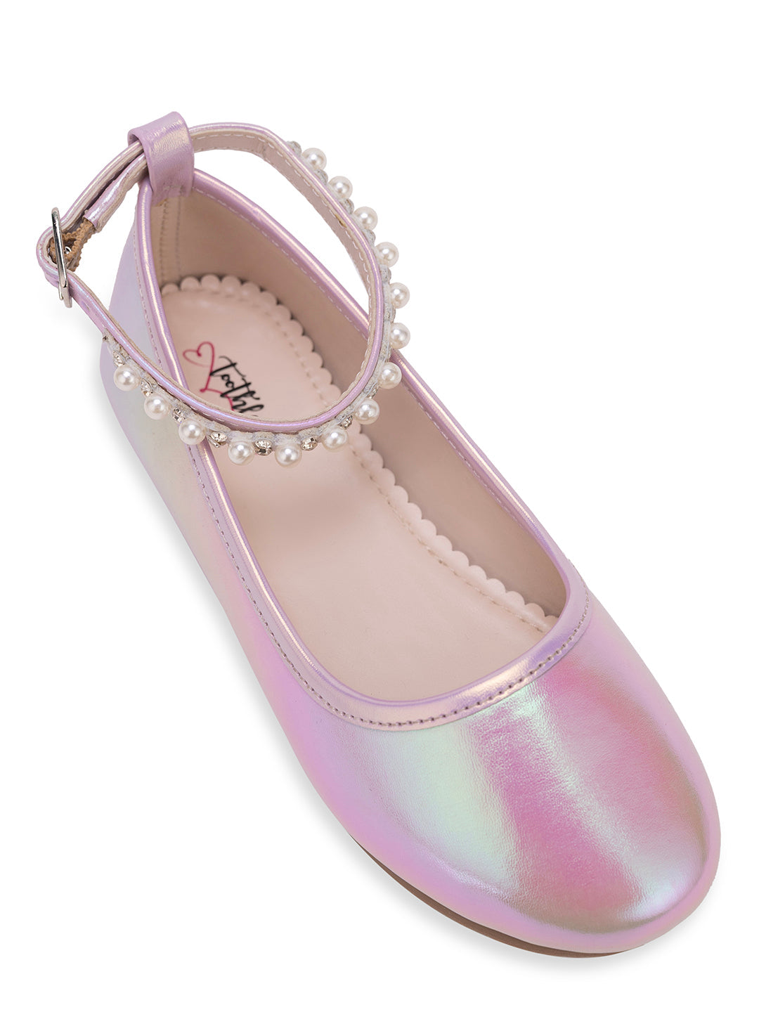 Kids Girls Embellished Shimmer Ballet Flats with Pearl Beaded Ankle Strap