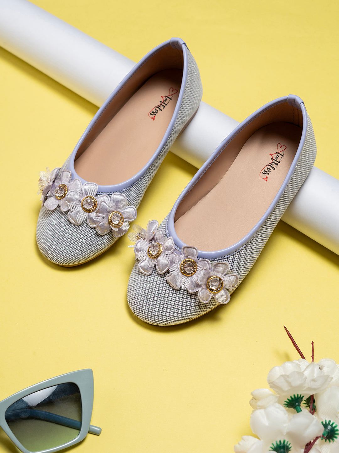 Kids Girls Lavender Ballerinas with Floral Embellishments and Glitter Finish