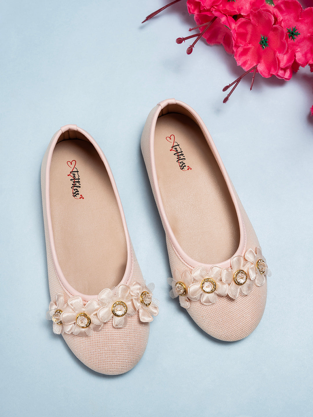 Kids Girls Peach Ballerinas with Floral Embellishments and Glitter Finish