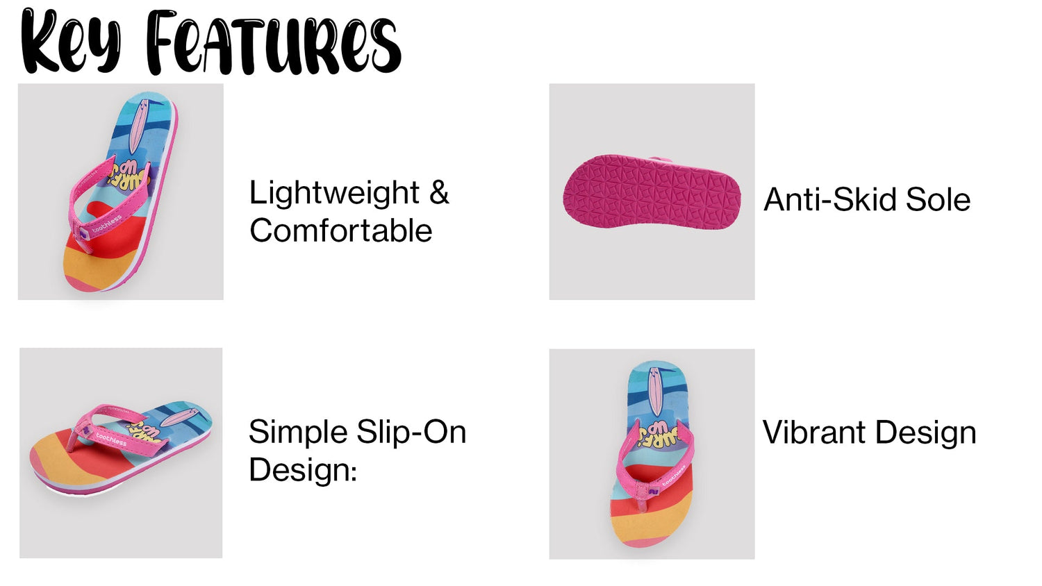 Crafted with a soft, cushioned EVA sole, they offer excellent flexibility and comfort, making them ideal for active kids. The lightweight design and open-toe structure ensure proper airflow, keeping feet cool even on the hottest days. The anti-slip textured outsole provides stability and grip, reducing the risk of slips on smooth surfaces. With a comfortable toe post and secure thong strap, these flip flops are easy to slip on and off, just what your child needs for quick outings or playtime.