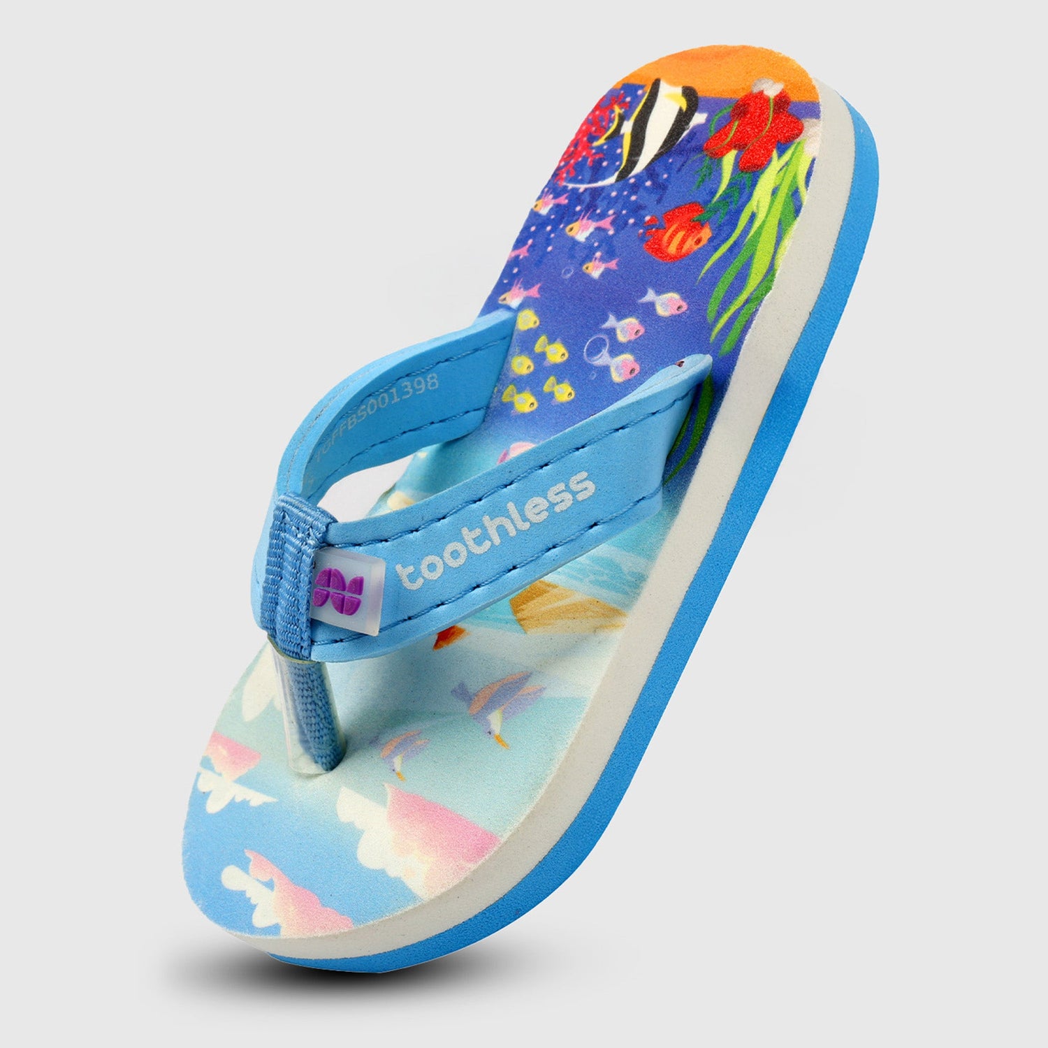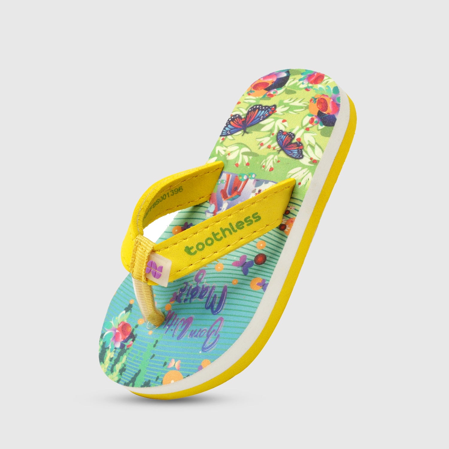Let your child step into a world of colour and comfort with the toothless Kids Flip Flops. With a vibrant butterfly and floral design over a pastel green base, these flip flops bring cheerful vibes to every step. Perfect for sunny days, beach outings, or relaxed indoor play, they’re designed to offer comfort, flexibility, and a splash of fun.
