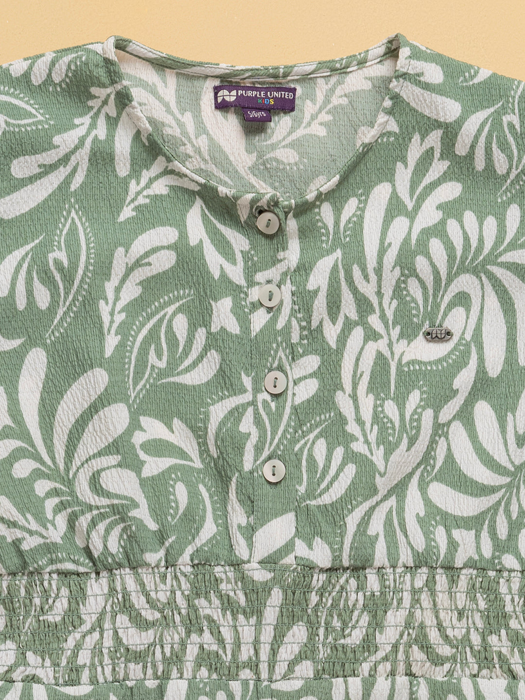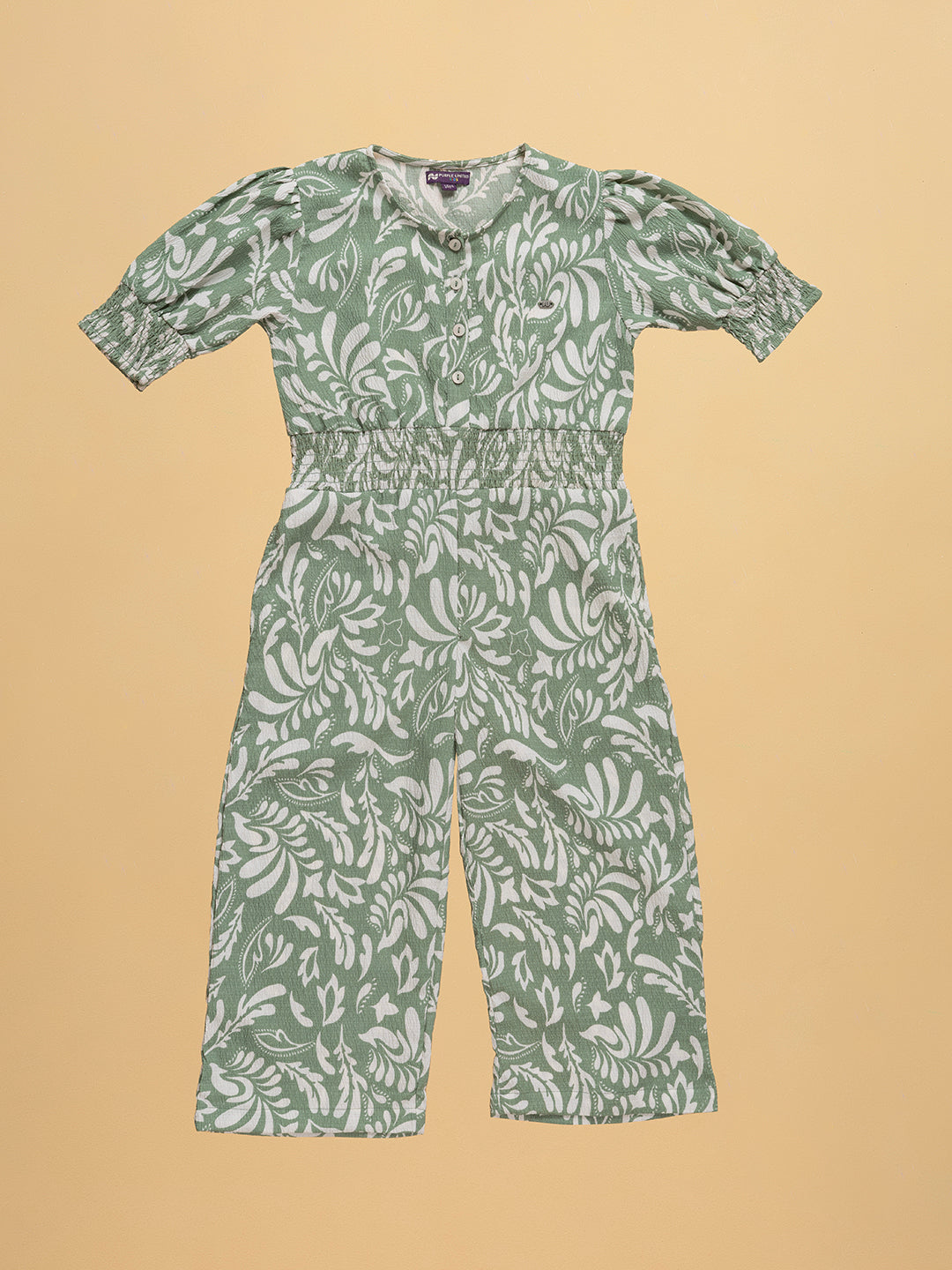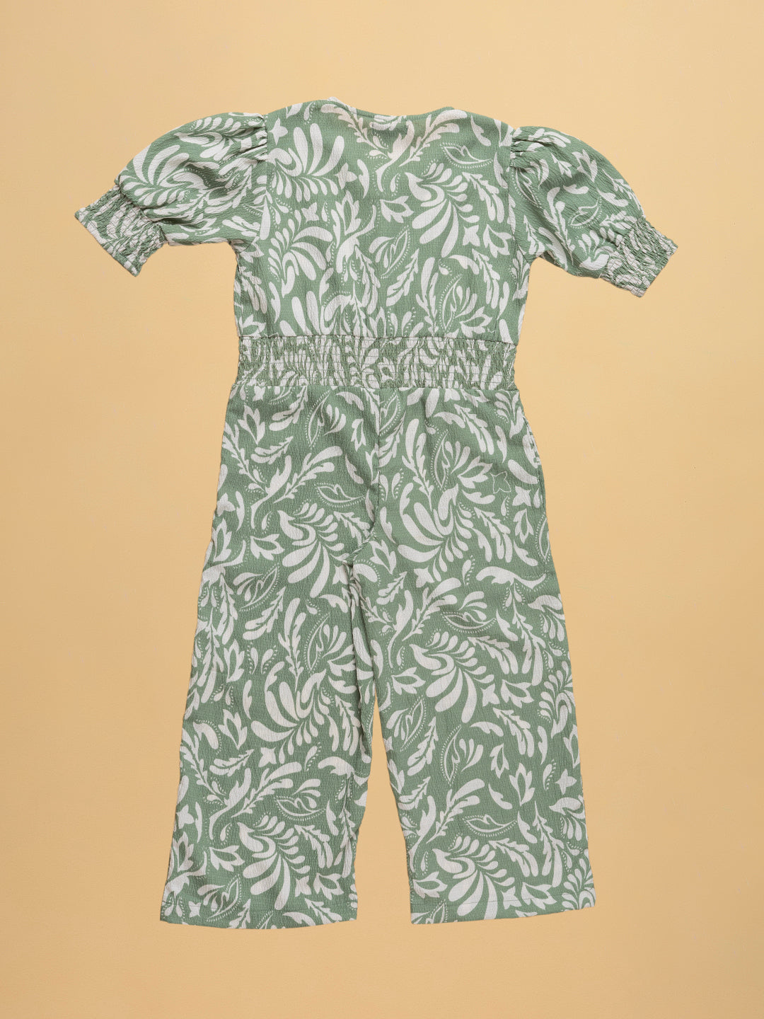 Kids Girls Floral Printed Round Neck Jumpsuit With Gathered Puff Sleeves
