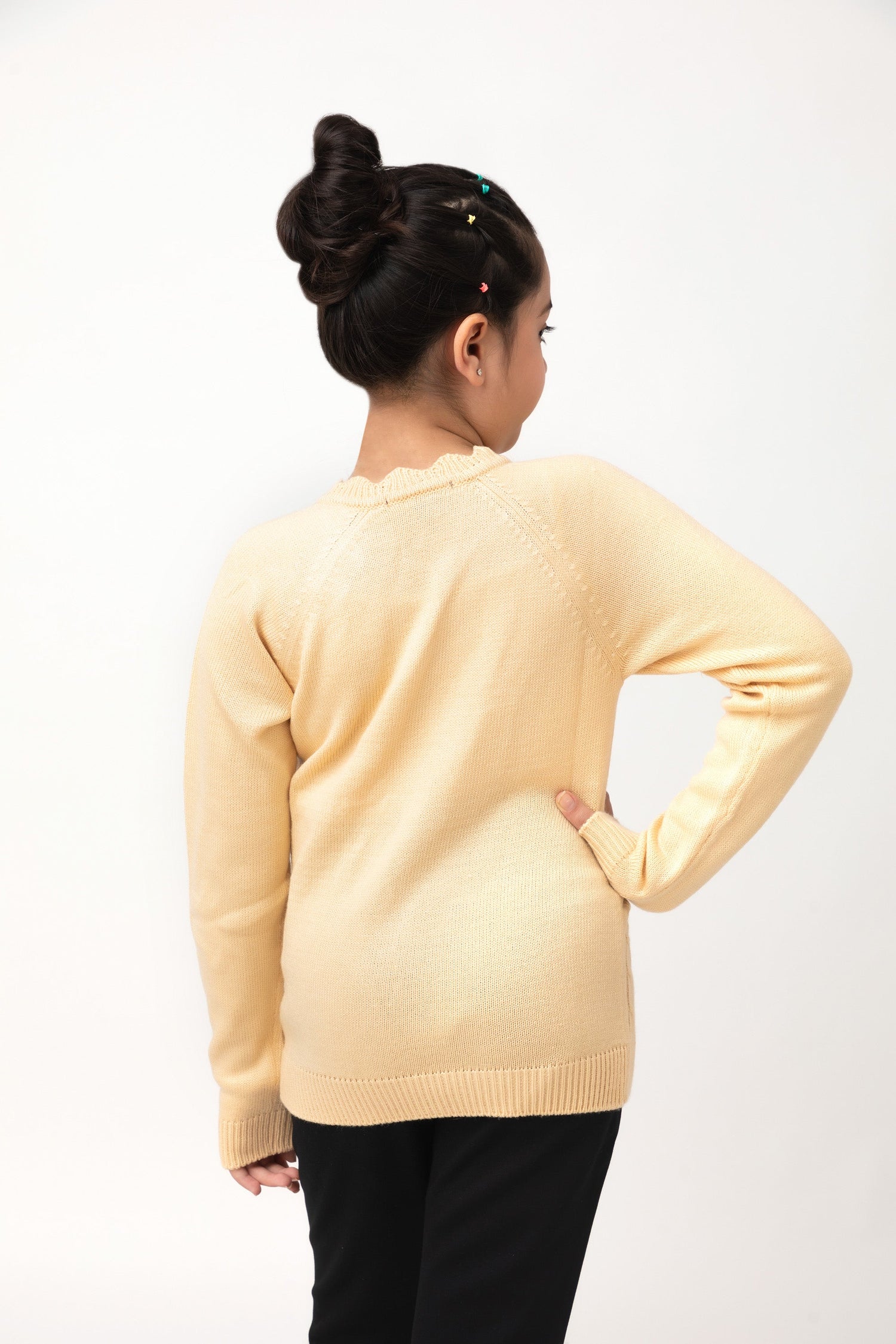 Kids Girls Full Sleeves Scalloping Neck Sweater with Glitter Plastic Button Detailing
