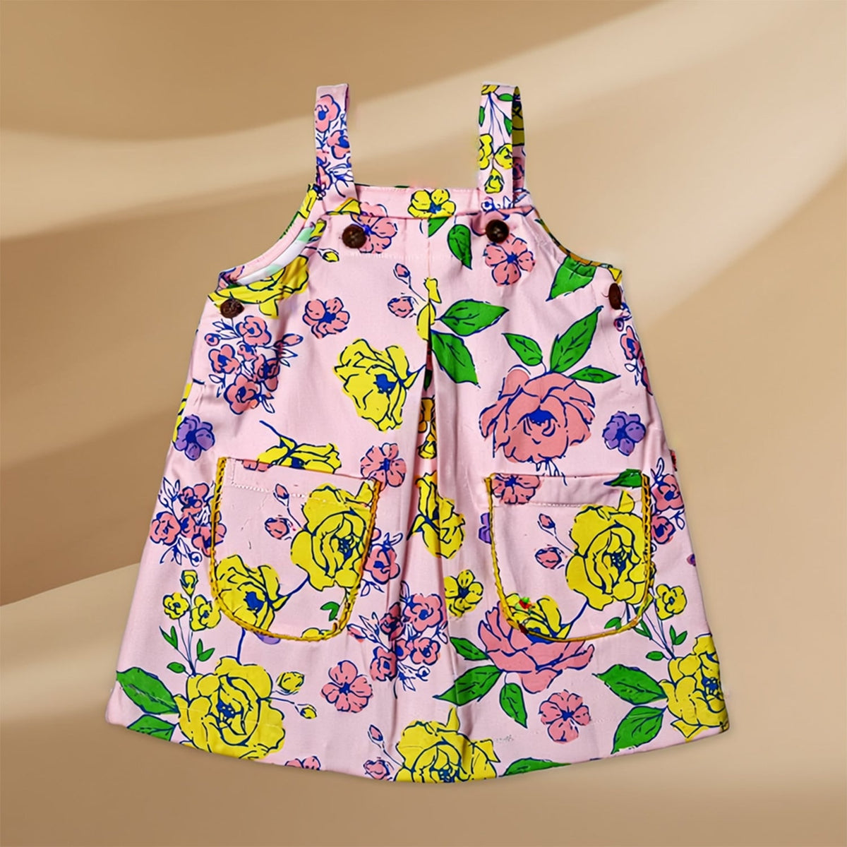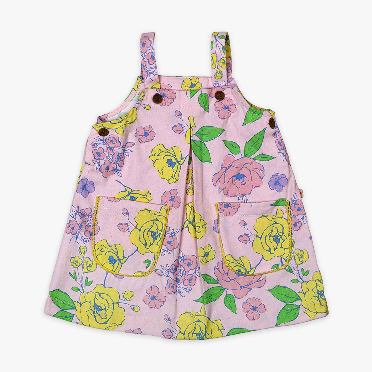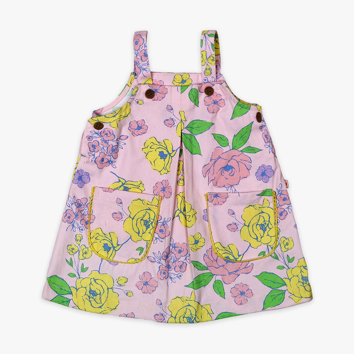 Girls Kids Light Pink Sleeveless Floral Printed Dress Cotton-blend fabric Dungaree Dress with Front Pockets Adjustable button straps Casual Summer Dress for Kids
