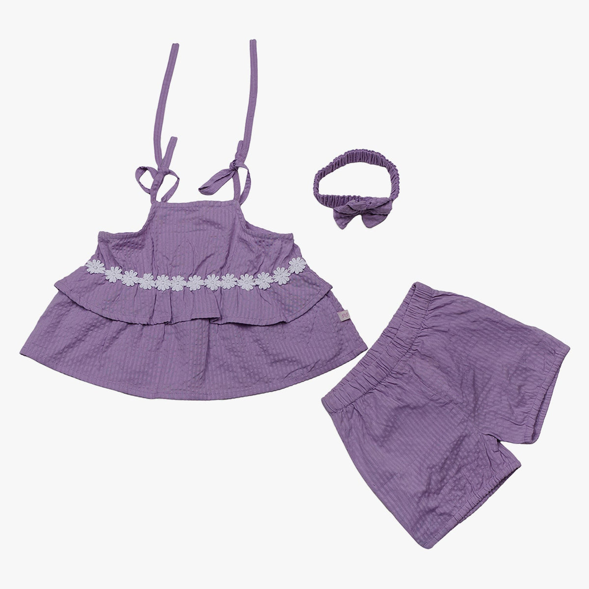 Girls Lavender 3-Piece Summer Co-Ord Set Strappy Ruffle Top, Shorts & Headband Soft Stylish & Lightweight Casual Wear