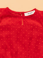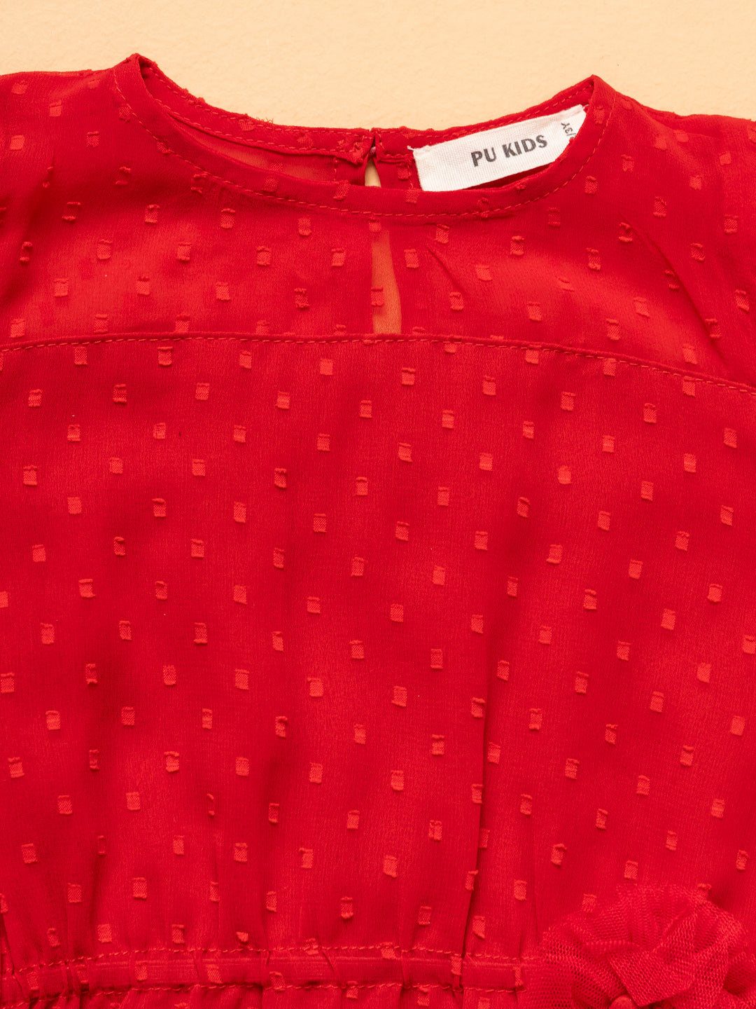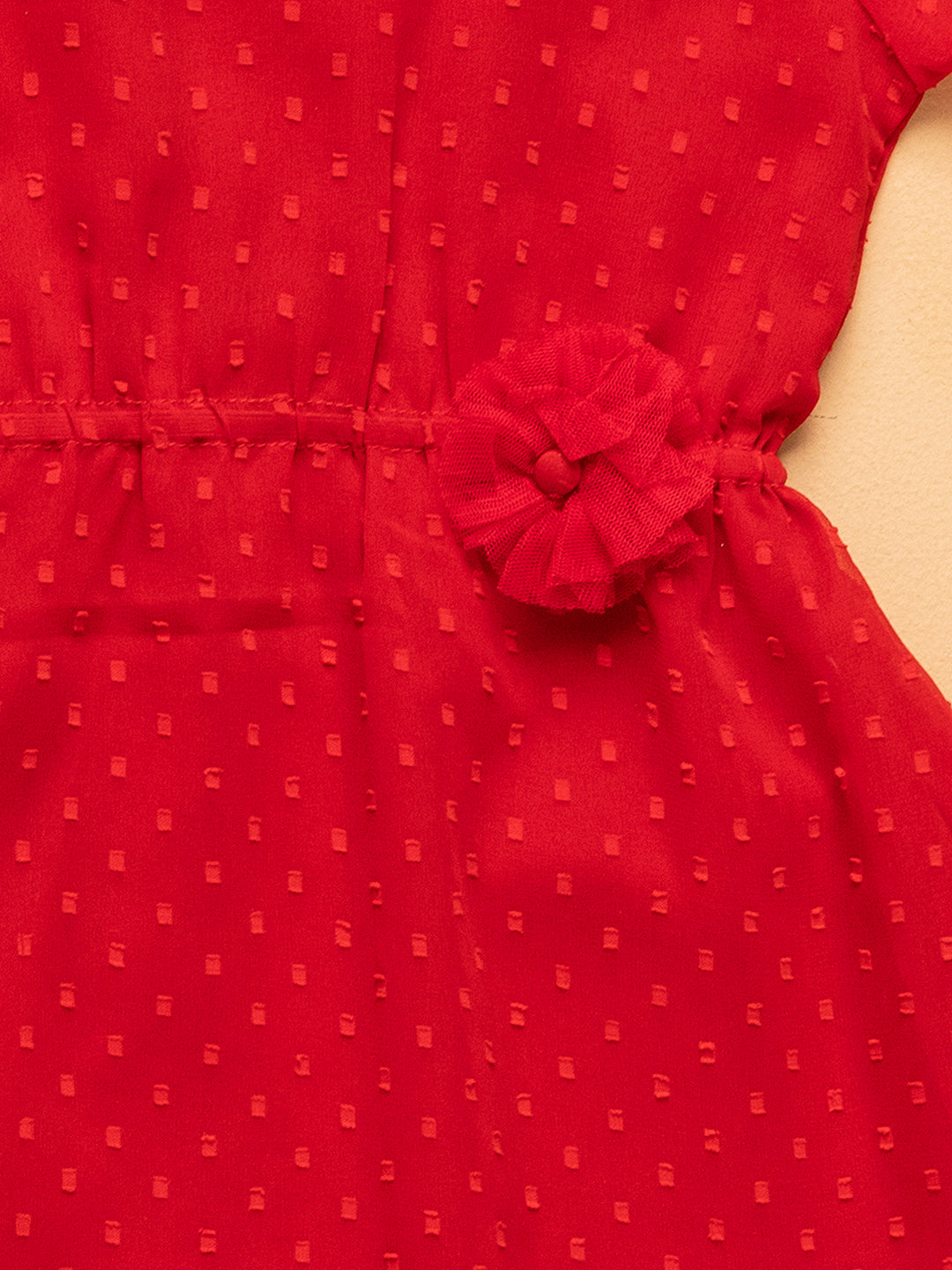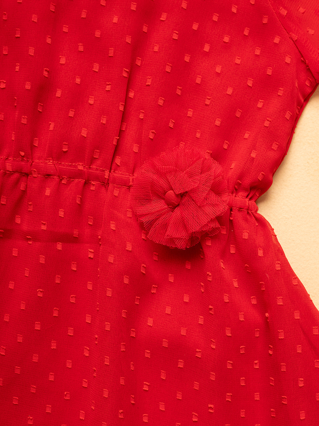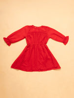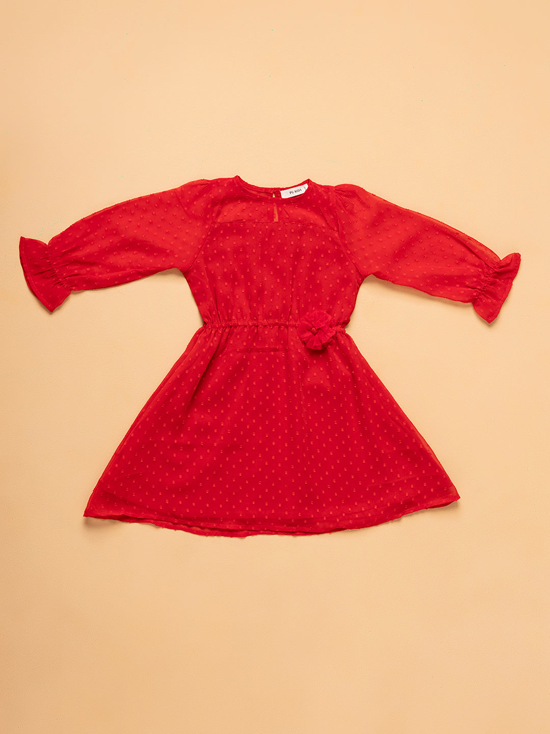 Kids Girls Textured Fit & Flare Full Sleeves Dress with Elastic Cuffs & Floral Waist Detail