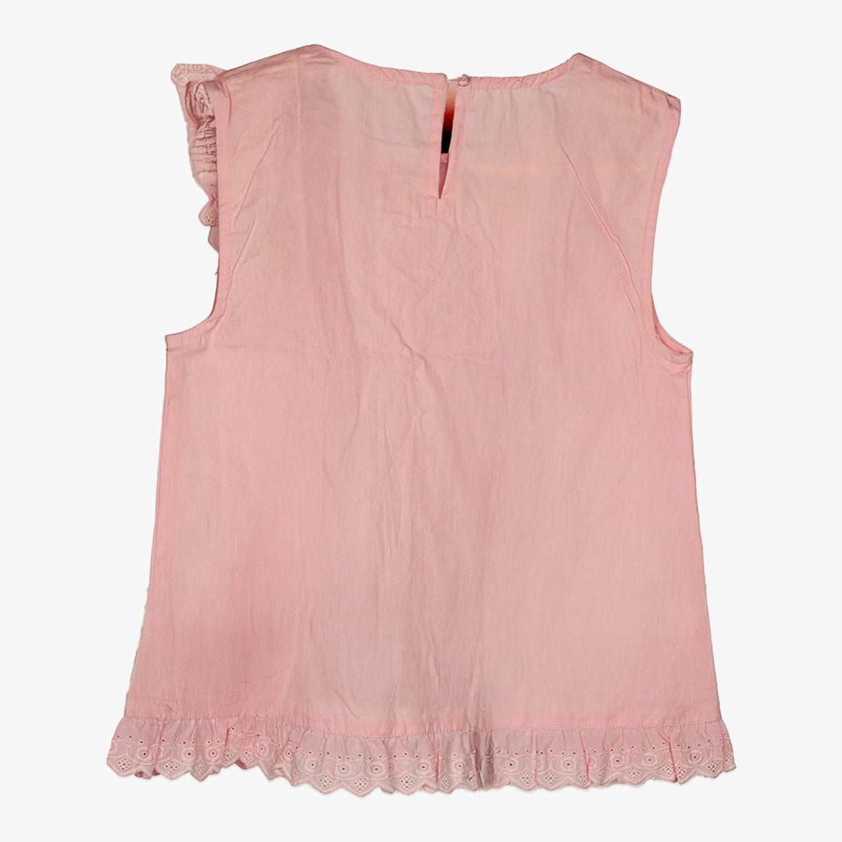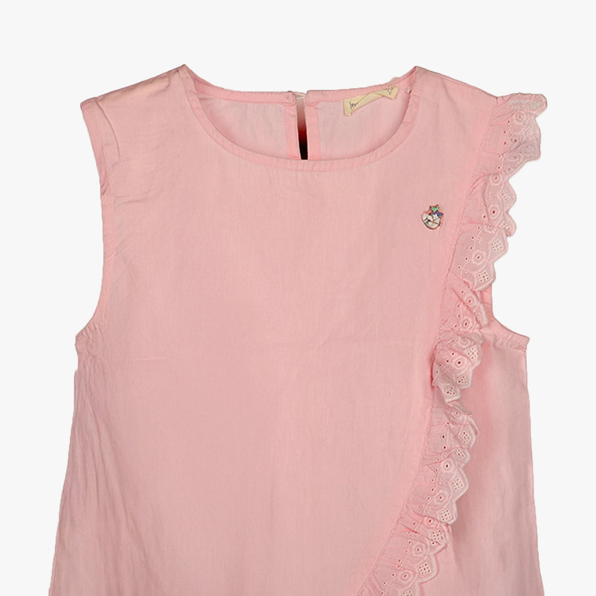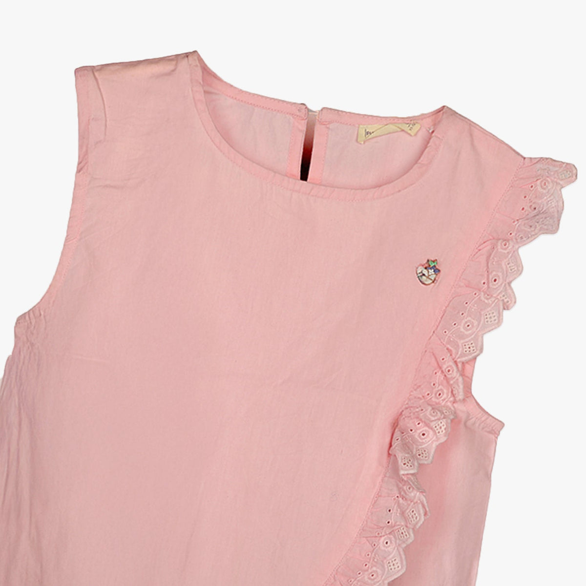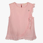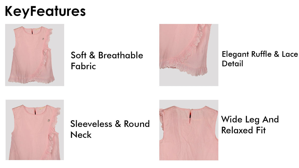 Girls Light Pink Sleeveless Top Soft Cotton Blend Round Neck Solid Color Soft & Breathable Fabric Lace Ruffle Detail Casual & Party Wear