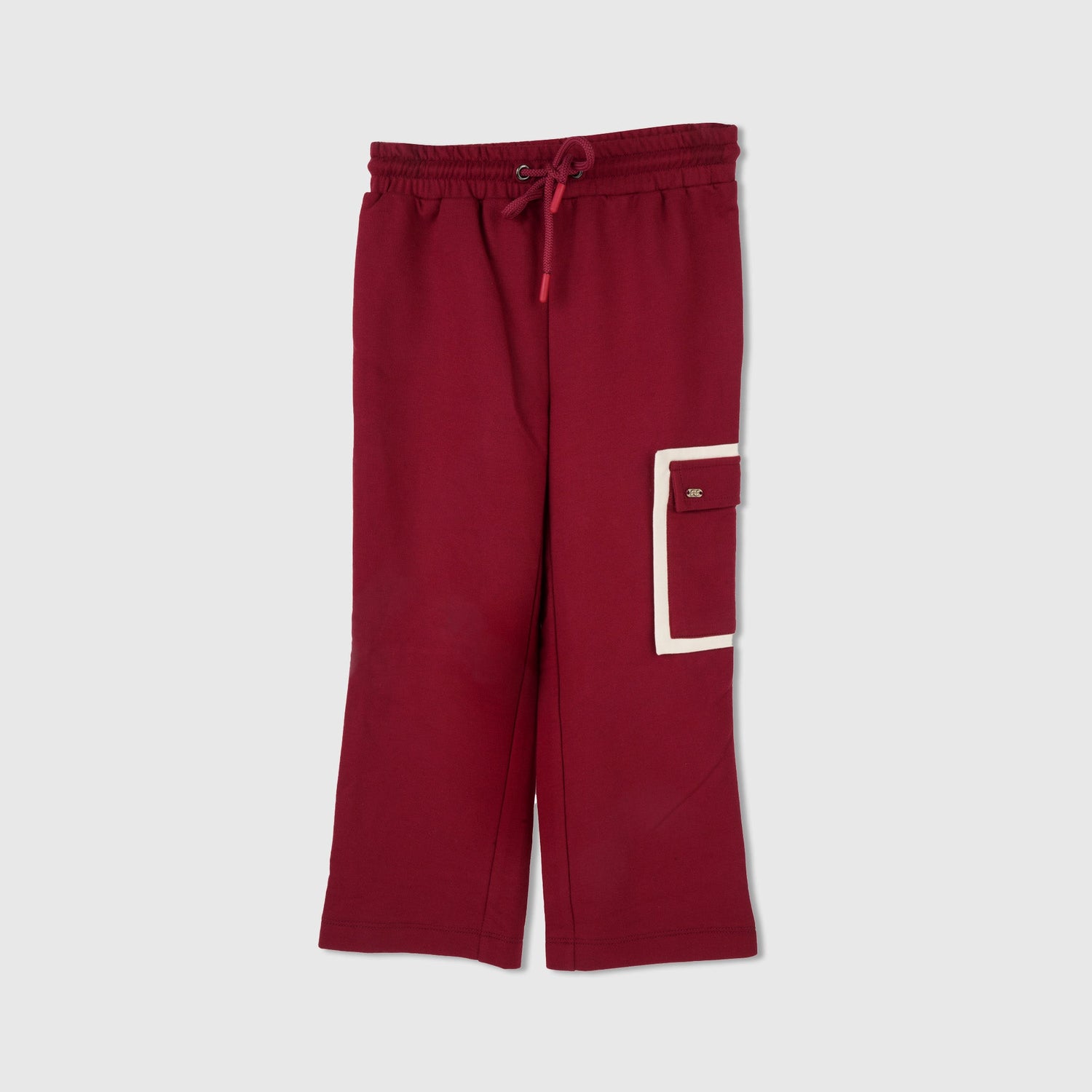The pants feature a wide-leg silhouette that allows unrestricted movement, giving a cool, relaxed vibe while keeping kids comfortable all day long. A standout contrast pocket design outlined in white adds a bold, stylish touch to the deep maroon base, enhancing the overall aesthetic with a playful twist. The elastic waistband with an adjustable drawstring ensures a secure, customized fit that adapts as your child grows, while the functional pockets provide convenient storage for small essentials.