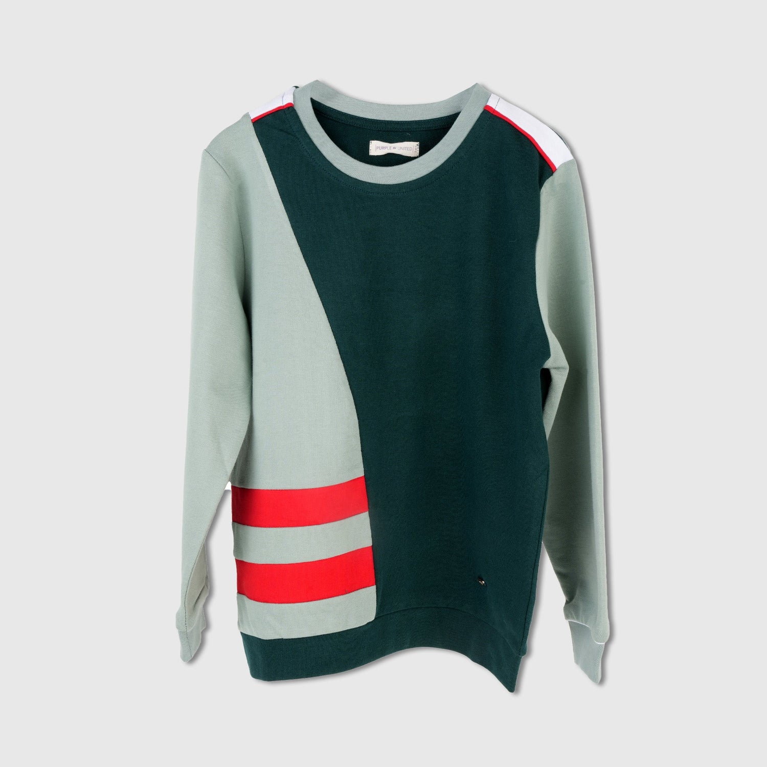 The sweatshirt features a unique green and grey colorblock design, enhanced by bold red stripe accents on the sleeves and body for a striking, athletic-inspired look. The classic crew neckline and ribbed hem and cuffs ensure a snug, comfortable fit that stays in place through every adventure.