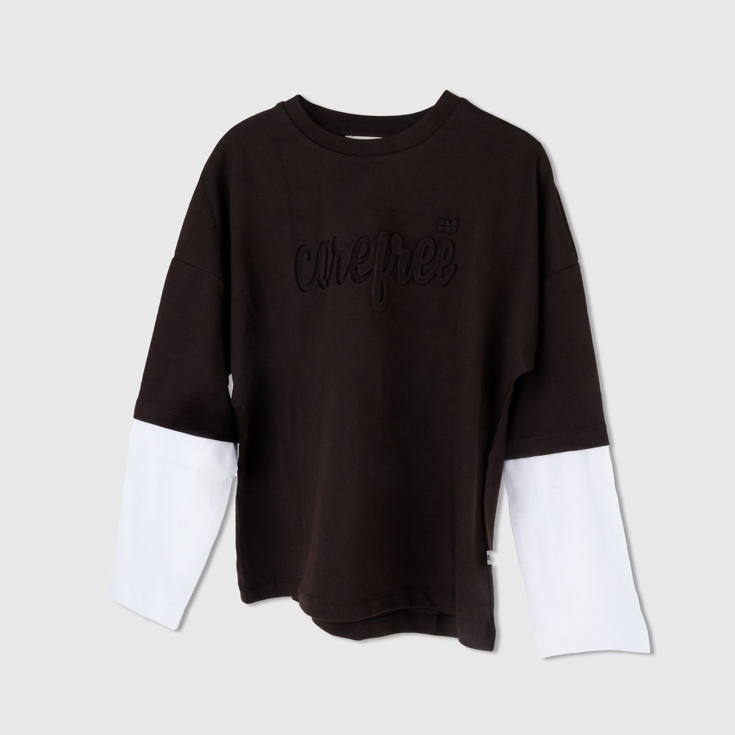 The T-shirt features a raised embossed “Carefree” text design across the chest, adding a subtle, tactile element that elevates its look. The bold black base is complemented by contrast white sleeve panels, giving it a cool, layered appearance that brings a modern edge to casual dressing. The crew neckline ensures a neat fit, while the relaxed drop-shoulder silhouette allows for effortless movement and everyday ease.