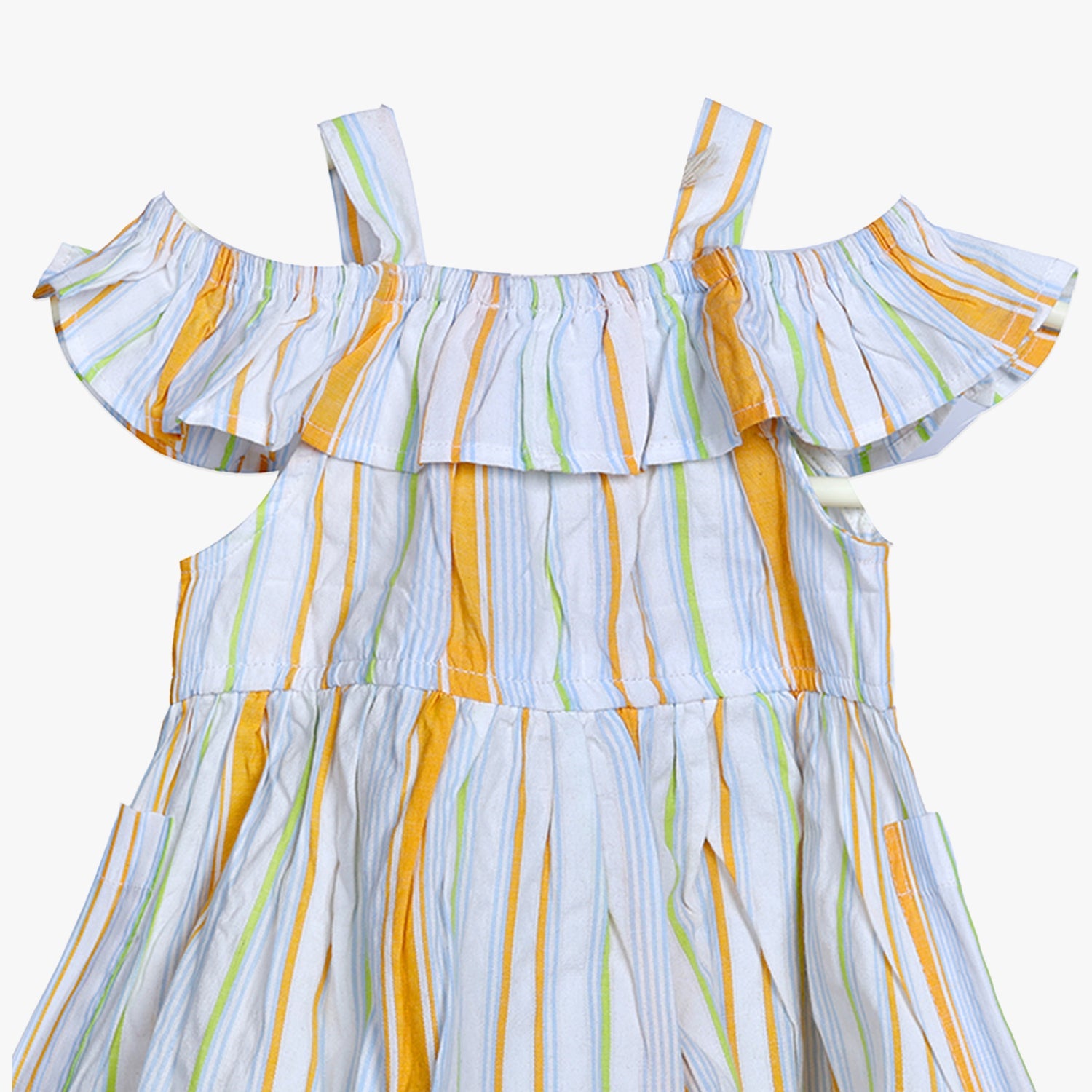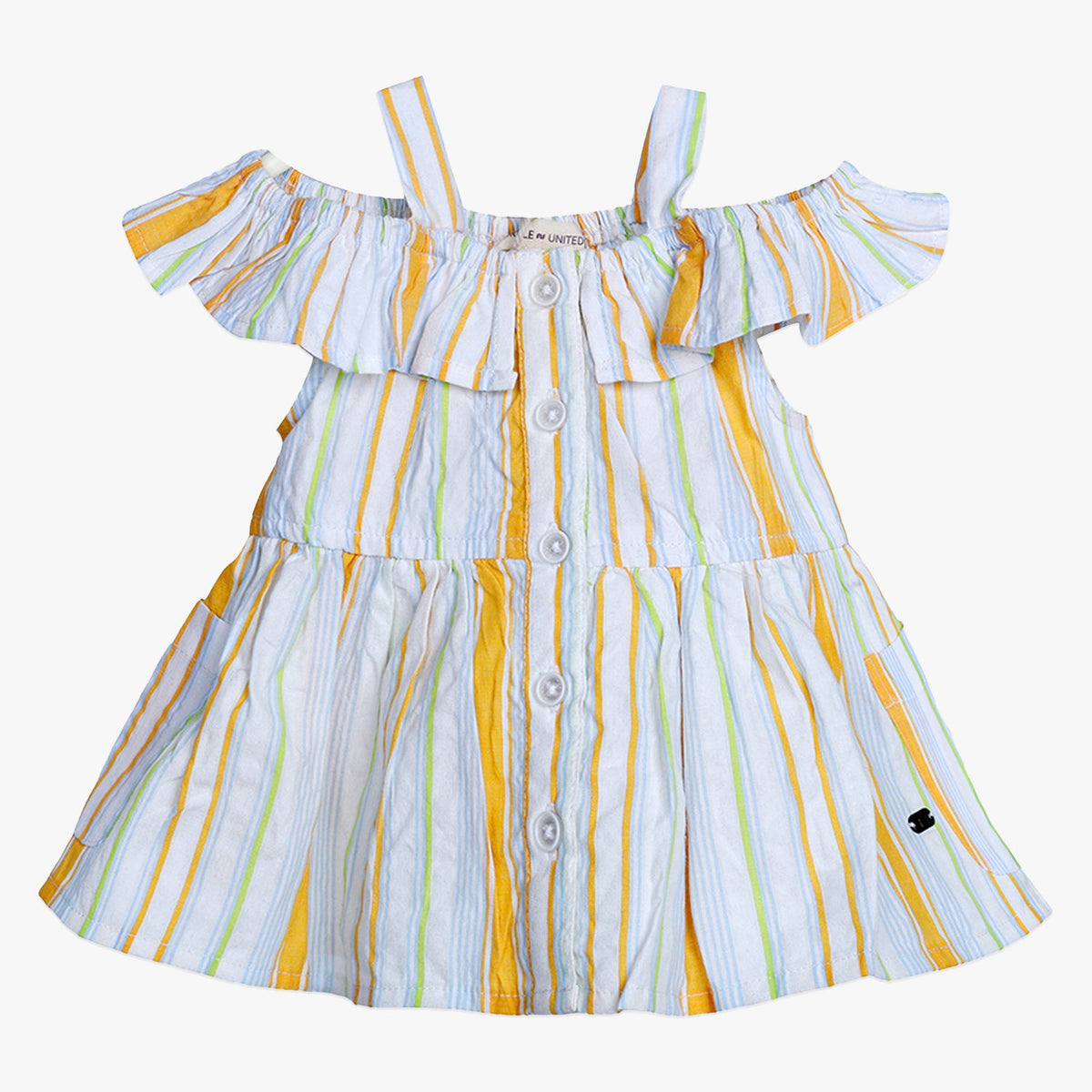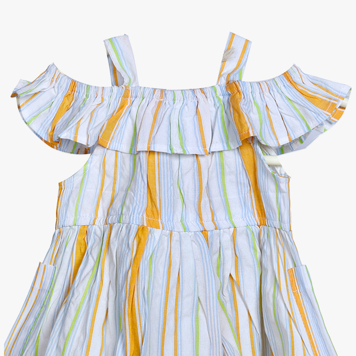 Designed with a playful off-shoulder ruffle detail and supported by slim shoulder straps, this dress brings a chic yet practical look to your child’s everyday outfits.