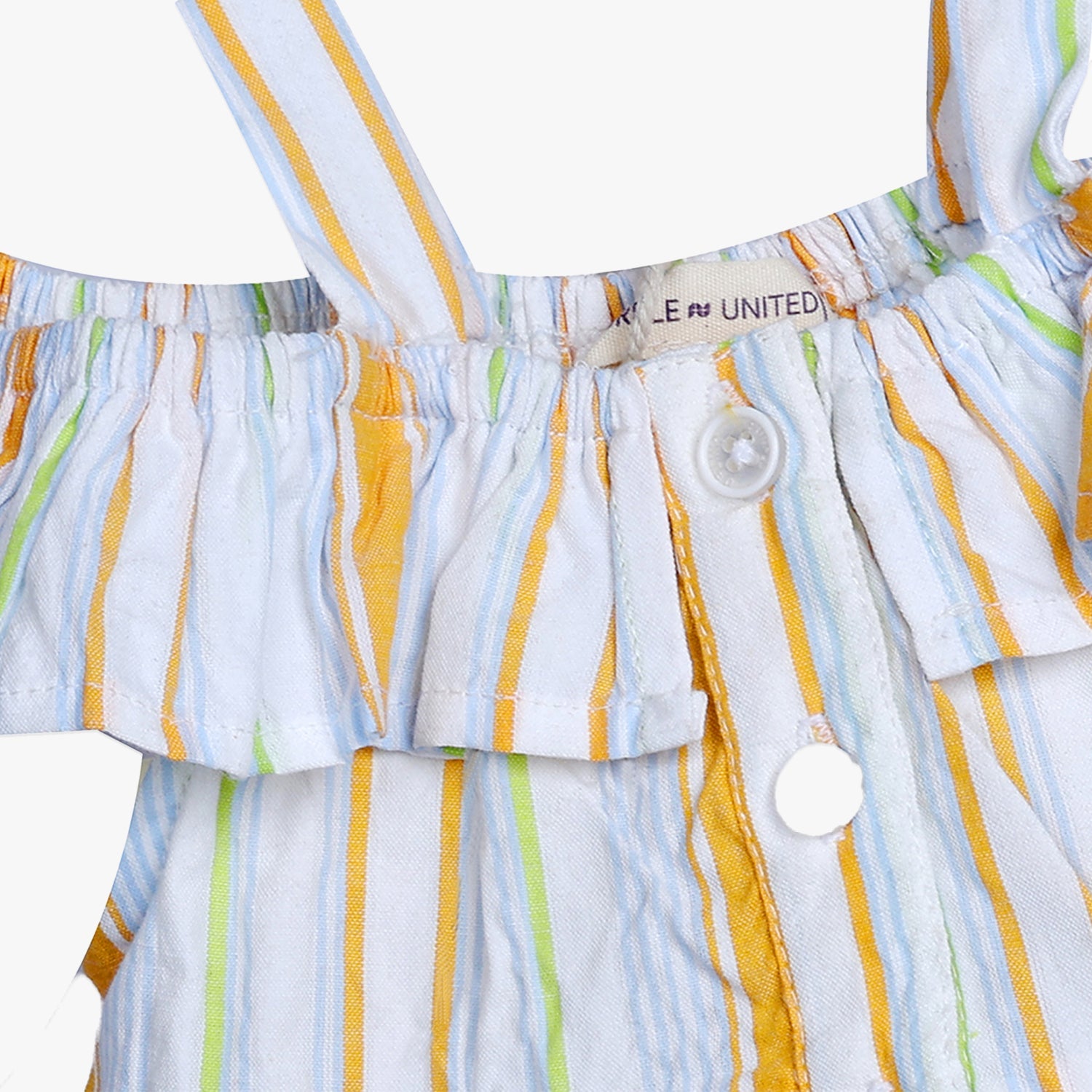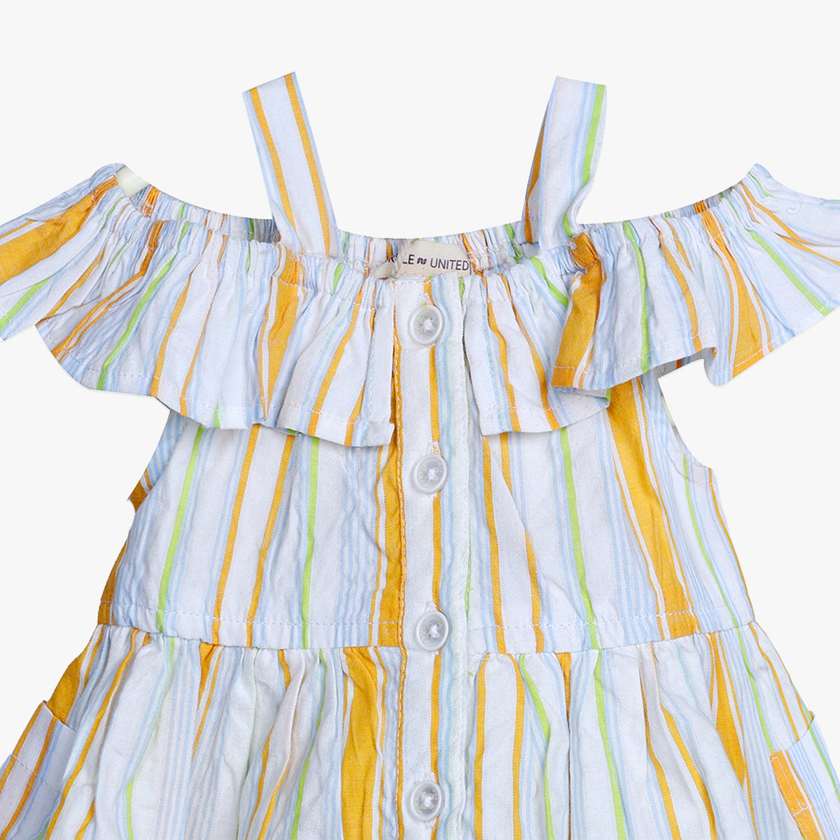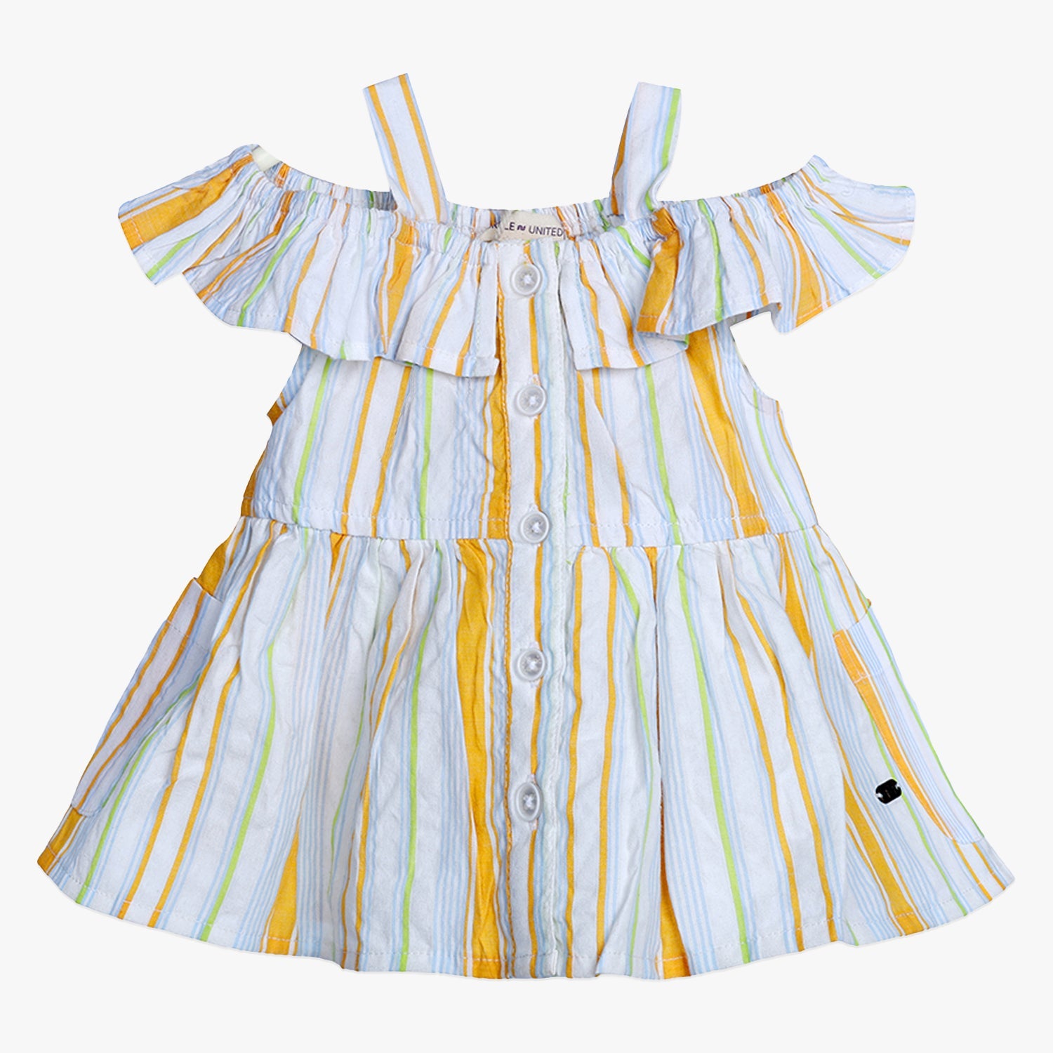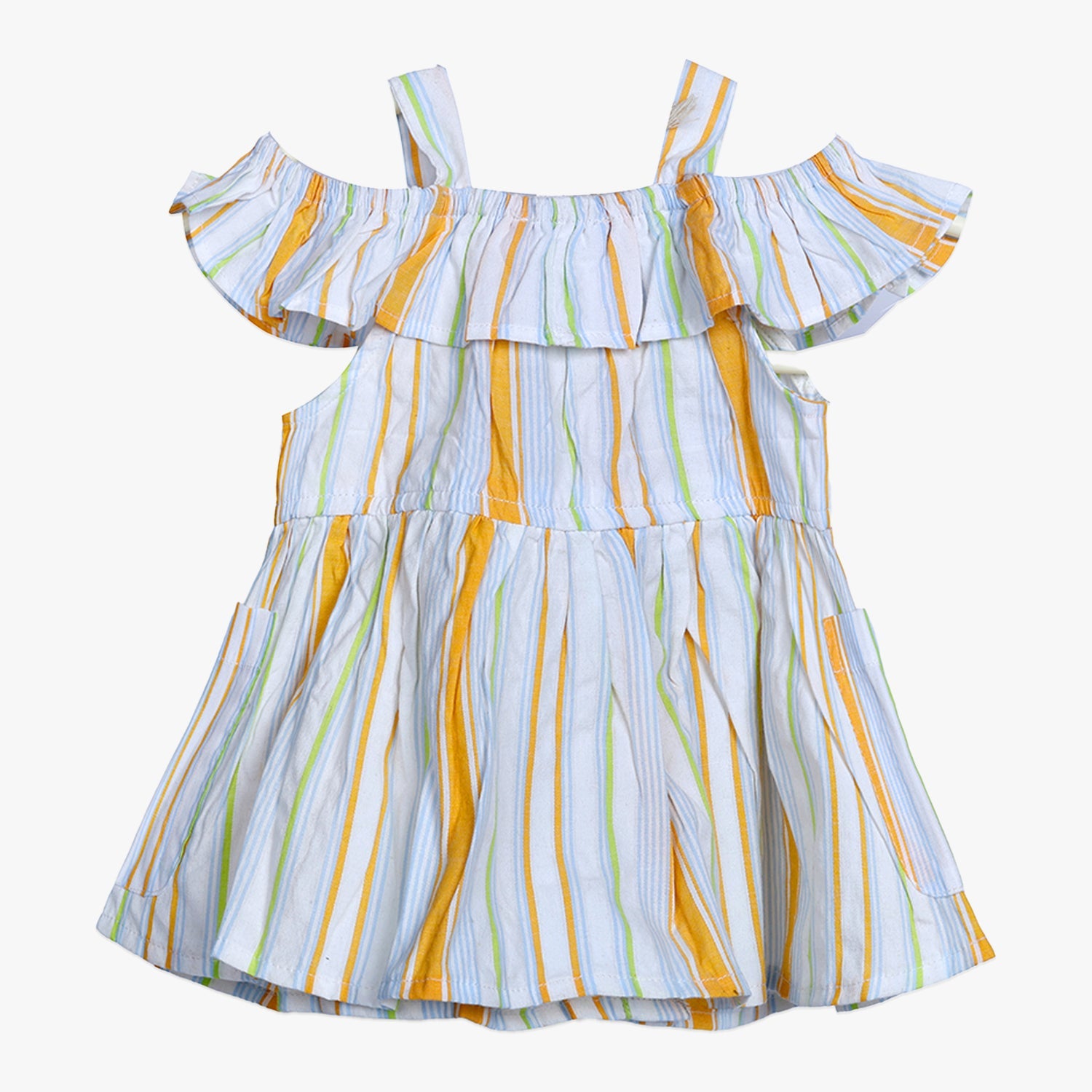 Designed with a playful off-shoulder ruffle detail and supported by slim shoulder straps, this dress brings a chic yet practical look to your child’s everyday outfits.