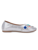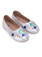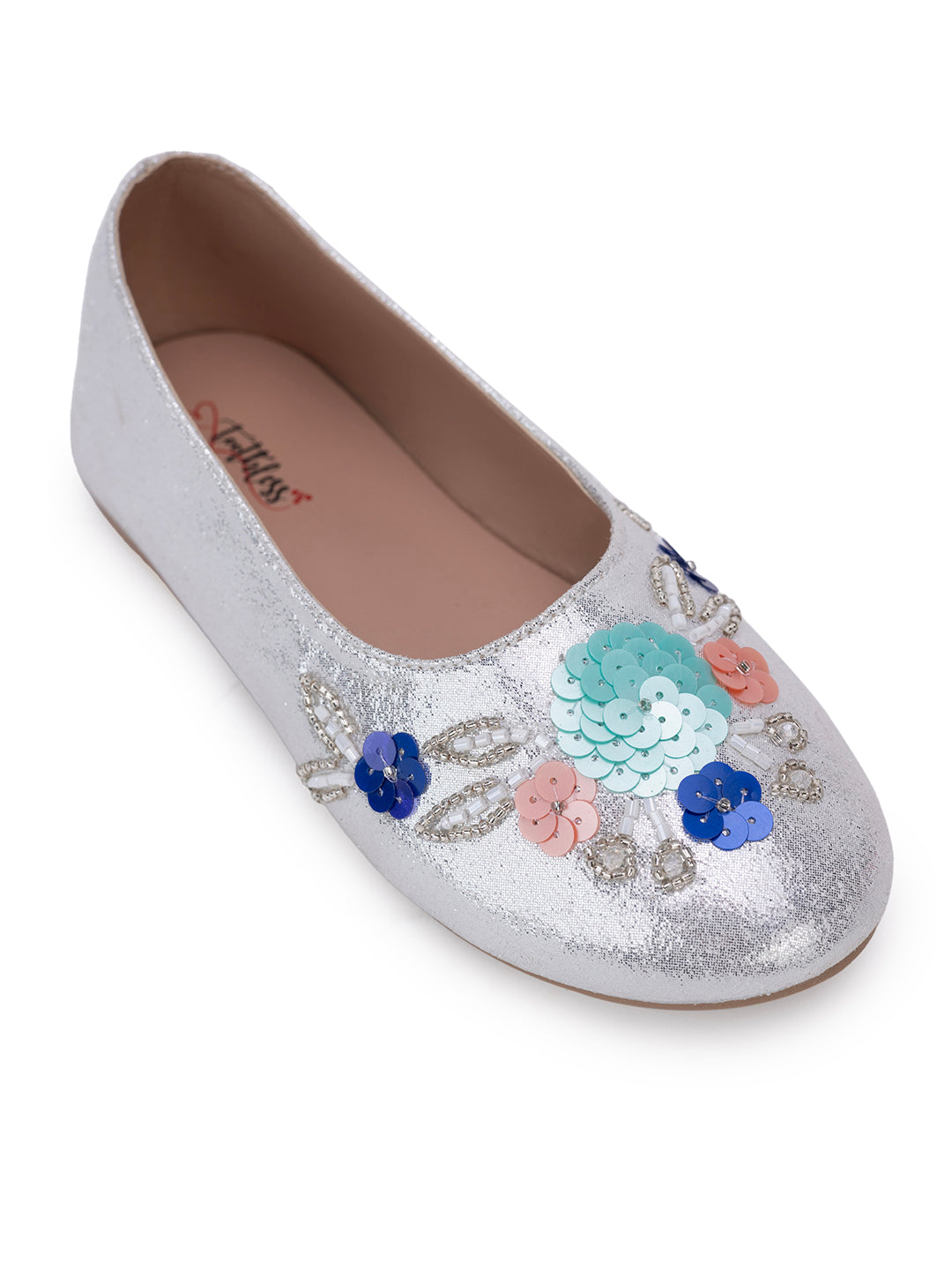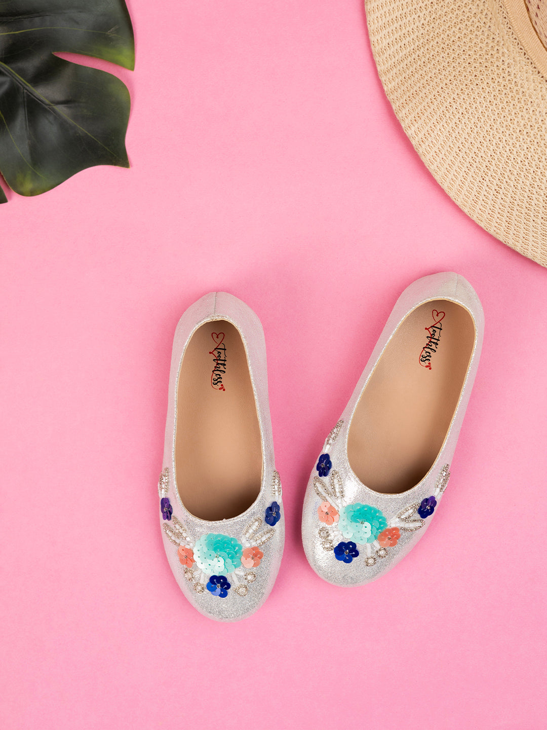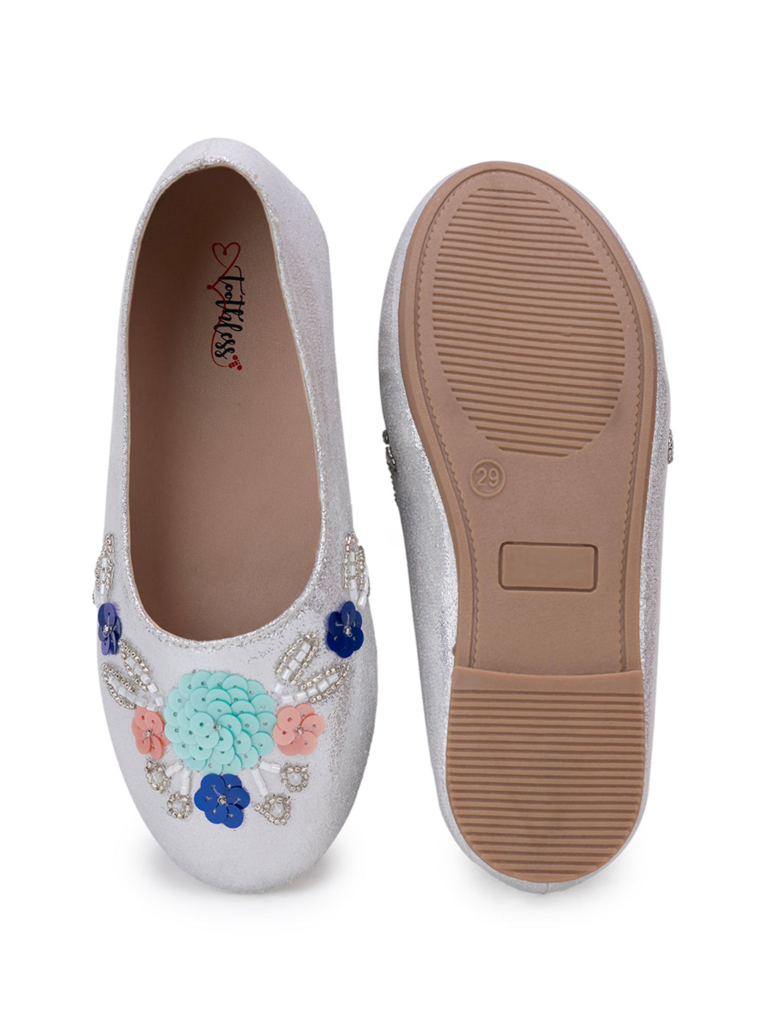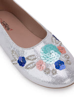 Kids Girls White Sequin Ballet Flats with Colorful Floral Embroidery